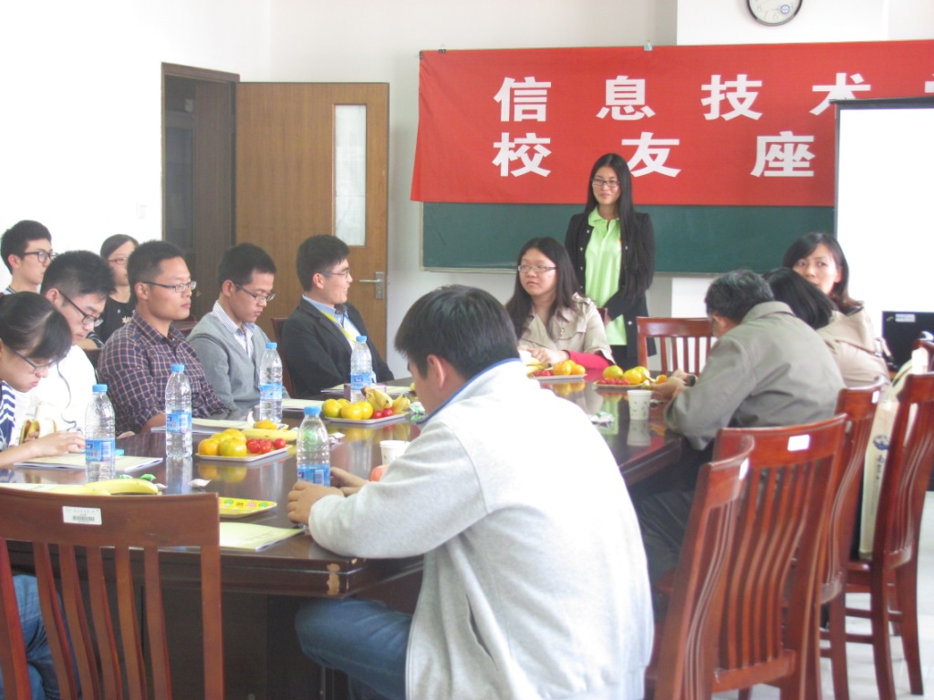 20141015南京中医药大学信息技术学院优秀校友与在校生交流会在B4-416举行,参与老师有沈静老师、施诚老师、吴娱老师等,优秀校友有杨涛、陈星星、顾雁囡、王磊等,在校的大一至大四各个班级代表积极参加了此次交流会。