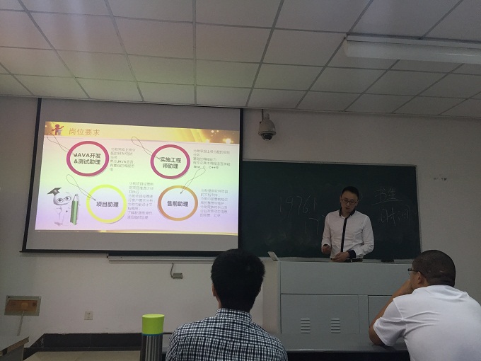 首先企业负责人简单介绍了公司的基本情况:江苏达科信息产业集团是一家从事网络系统集成、自主软件研发以及物联技术研发为一体的高新技术企业。接下来负责人介绍了公司针对实习生打造的培训计划以及进入公司后的发展空间和美好愿景。期间还有一位去年刚进入公司的吴嘉学长分享了他这一年来进入公司后的体会和成长。最后企业负责人宣布了此次招聘的岗位和具体要求。