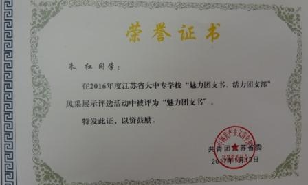 我院2014级计算机科学与技术专业团支书朱红同学荣获2016年度江苏省“魅力团支书”、2016年江苏省大中专学生志愿者暑期文化科技卫生“三下乡”社会实践活动“先进个人”,特此祝贺。希望全院同学能以朱红同学为榜样,努力学习、报效祖国。
