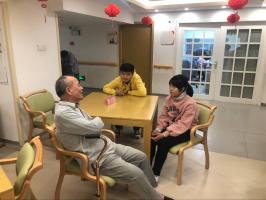 来到悦华安养院之后,负责人跟我们做了简单交流,随后将我们领到老人们集中活动的地方。老人们有的在看书,有的在下棋,有的在聊天。我们主动上前,跟老人们交流互动,聊天下棋,还有一些老人腿脚不便,我们用轮椅推着他们在院子里晒太阳。经过愉快的互动之后,我们把事先准备好的ppt放映出来,开展一次预防老人上当受骗的知识讲座,提高老人们的自我安全防范意识。
