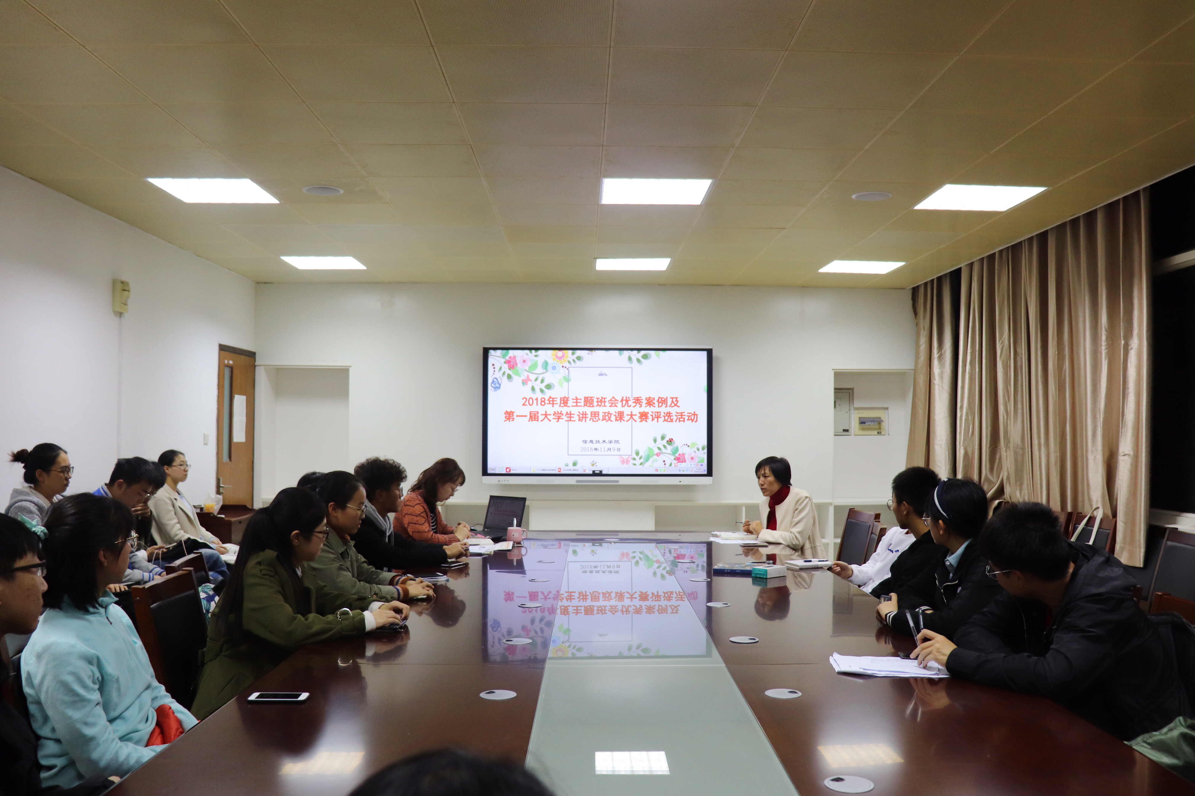 11月9日下午,我院在B4416会议室举行了2018年度主题班会优秀案例及第一届大学生讲思政课大赛评选活动。出席本次会议的有学工办沈静老师、刘小平老师以及各班班长、团支书。本次会议由沈静老师主持。
