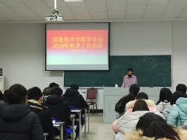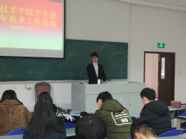 12月23日下午16:30,信息技术学院学生会于B4-102举办了2018-2019年度秋季工作总结大会,总结本学年上学期工作,强调部署下学期重点工作和任务。文体部严婧琰主持了本次大会,学工办诸葛健老师、沈静老师参加了本次会议。