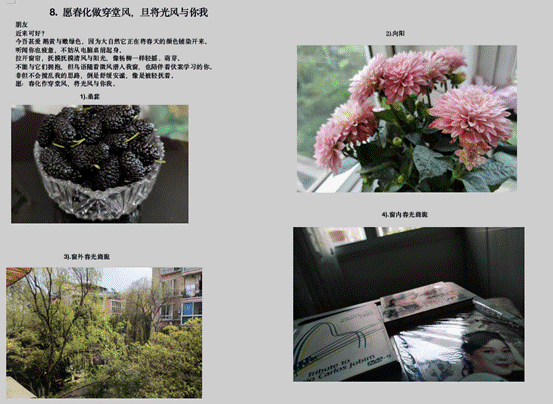此次活动,不仅表现了春天的美丽动人,还展现了中国虽处疫情期间却仍充满生机,一派欣欣向荣,更是表达了同学们对疫情能尽早结束的美好期盼!