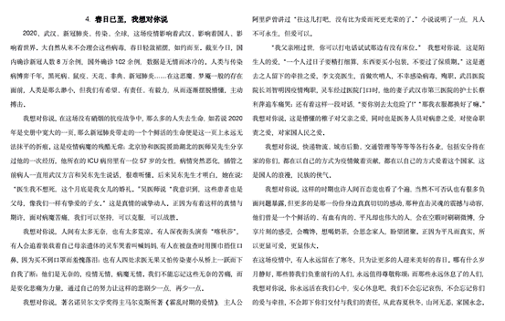 没有一个冬天不会过去,没有一个春天不会到来。在无数无私奉献地医护工作者的努力下、全人民的配合下,我们终于可以重返校园、人们也可以重返自己的岗位。今日的岁月静好,都是无数无私的人负重前行换来的,我们都应好好珍惜,这些英雄都应被铭记!希望我辈能传承这精神,成为时代的担当者。