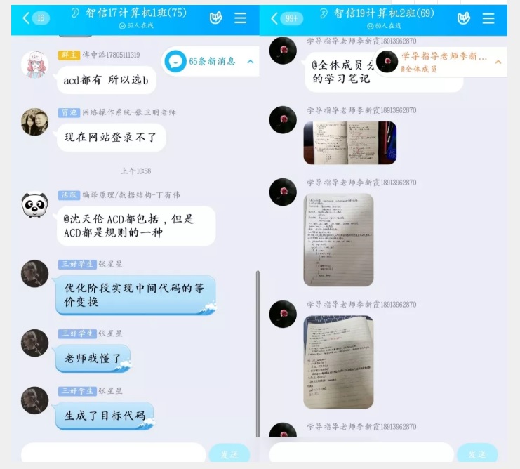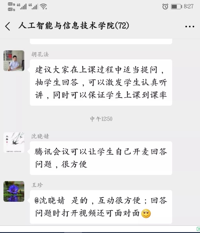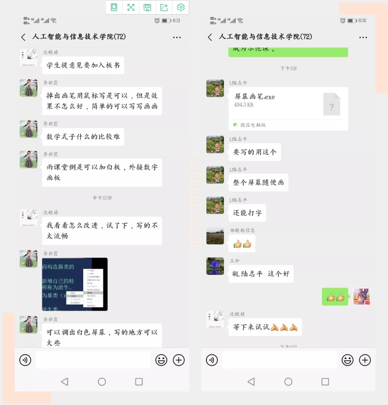 2月17日中午,院领导和教科办及时向师生收集在线教学的问题反馈,如:有教师反映学生需要板书不知如何操作,立即有其他教师现场教学,迅速解决了问题,保证了之后的课程更好进行。