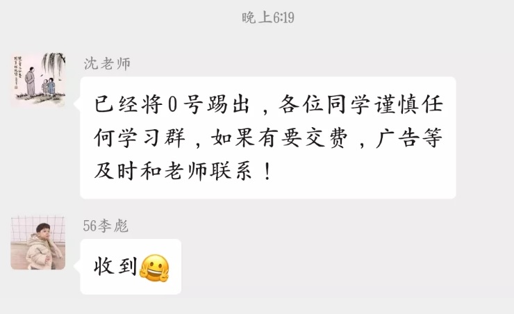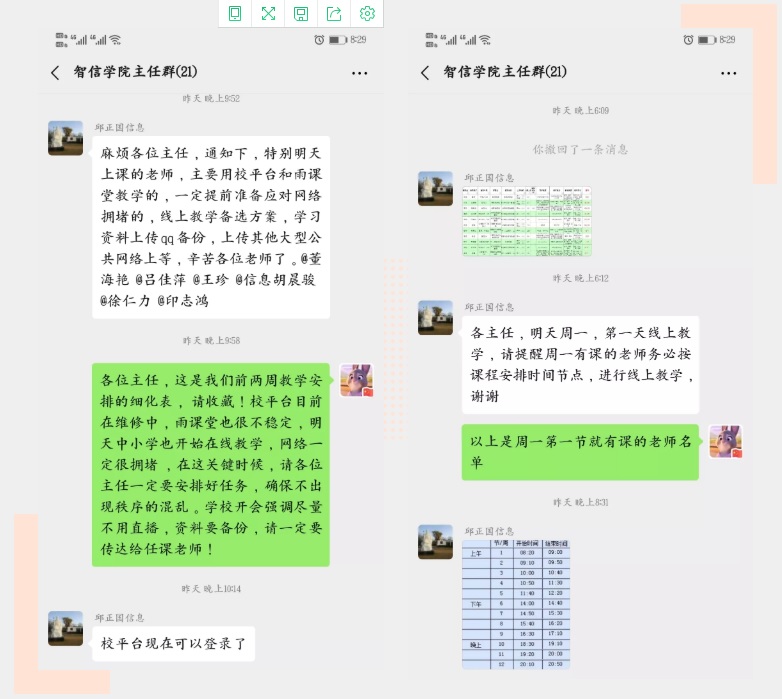 此外,学业指导老师们还密切关注着班级的方方面面,有陌生人误闯课程群时,及时解决并提醒同学注意安全;课前一晚提醒大家第二天早些起床……尽心尽责为每个班级的线上教学保驾护航。