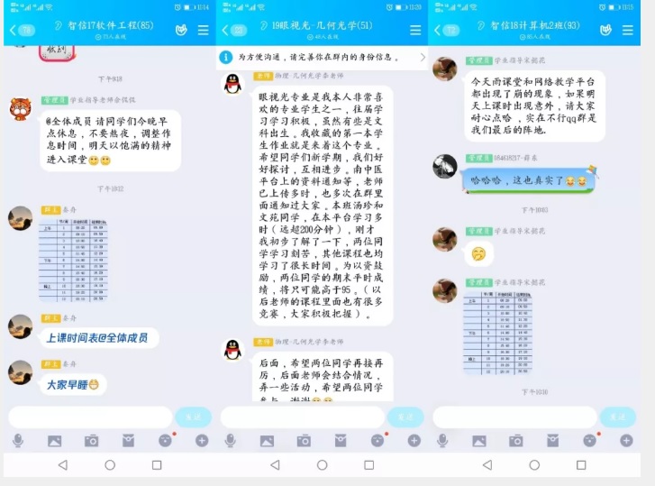 学业指导老师作为各班级的“学业引路人”,开学第一天都在班级群里早早上线,等待同学们的到来,陪伴着同学们完成一天的课程。在网络出现卡顿拥堵的问题时,帮助授课教师稳定学生情绪,顺利执行预案。