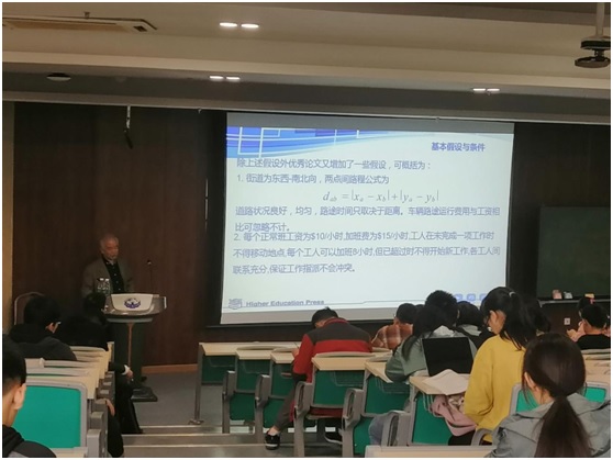 招新结束的第二天下午2点,邀请到了南京理工大学的俞军教授在B7-103教室进行了一次讲座,协会指导老师杨文国主持报告会,俞军教授以数学建模美赛B题为切入口向协会新人介绍了数学建模的基本内容,之后从B题的一篇优秀论文讲起,讲述了基本假设与条件、排序方法、算法描述、性能测量和结果分析几个方面,并对模型的结果提出了几点建议。