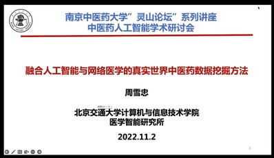 2022112日晚上730由南京中医药大学科学技术协会、中国中医药信息学会人工智能分会主办、南京中医药大学人工智能与信息技术学院承办的南京中医药大学2022“灵山论坛”系列学术活动——中医药人工智能学术研讨会线上举办,特邀请北京交通大学医学智能研究所所长周雪忠教授为我院全体师生做题为“融合人工智能与网络医学的真实世界中医药数据挖掘方法”的学术报告。会议由学院院长胡孔法教授主持,我院全体教师、研究生及相关人120参加了本次学术报告。