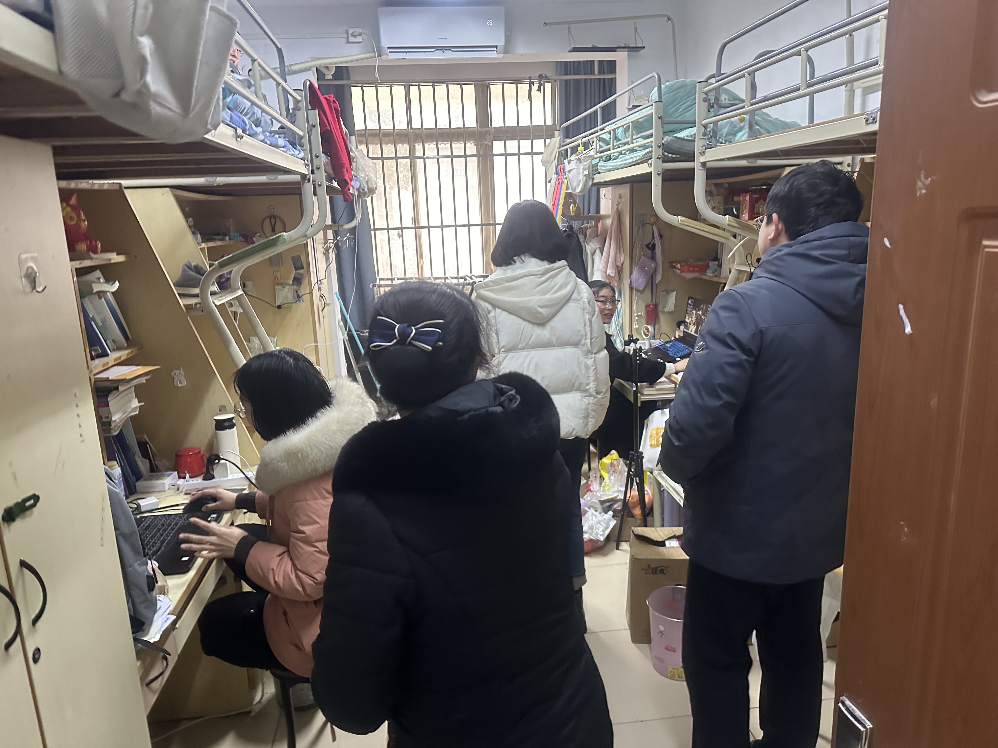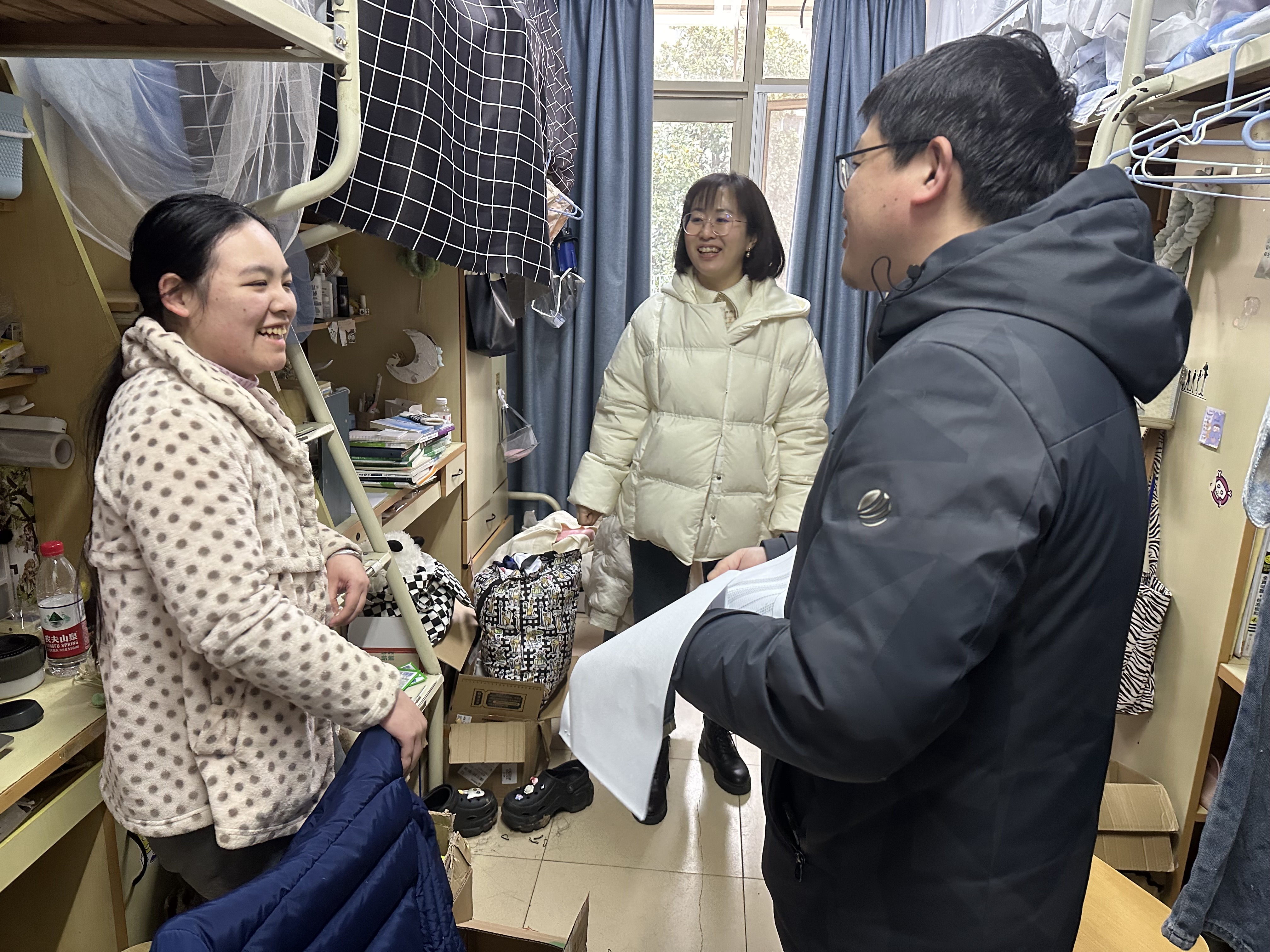 3月1日下午,学院党总支副书记李新路以及学工办主任张宁一、辅导员诸葛健进入学生宿舍开展新学期安全卫生检查工作。在宿管阿姨的带领下,从安全隐患、违章电器、环境卫生等方面对学院男、女生宿舍进行排查,对于个别存在问题的宿舍进行了登记和批评教育。李书记与同学们亲切交流,现场帮助同学解决了一些硬件报修的问题,对于一些同学提出的意见和建议都记录了下来。