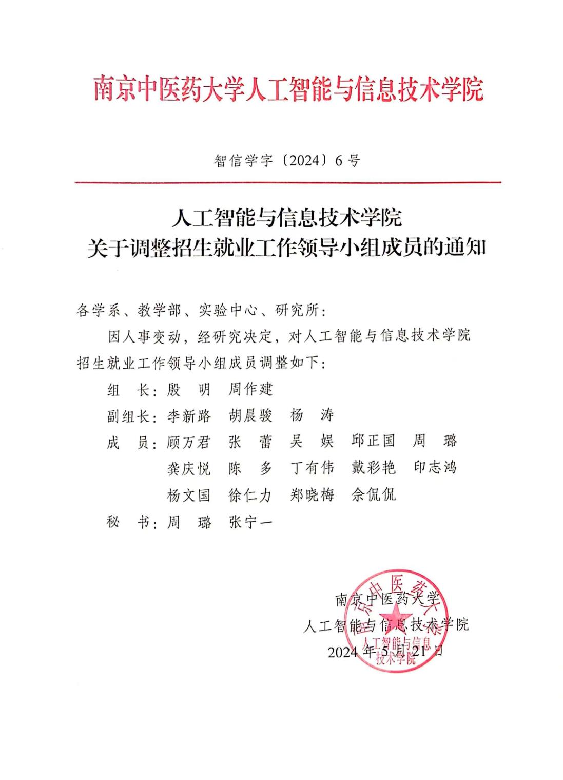 学院调整招生就业工作领导小组成员
