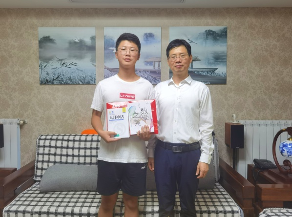 周作建向姜卓阳赠送书籍《数学之美》和《人月神话》,希望他可以通过阅读获得思想启迪,树立崇高理想,涵养浩然正气,为开启丰富美好的大学生活、感悟人工智能的科技之美奠定基础。