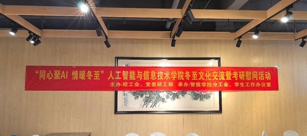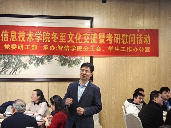 12月16日,人工智能与信息技术学院于南京中医药大学二食堂三楼举行 “同心聚AI 情暖冬至” 冬至文化交流暨考研慰问活动。校工会主席蔡爱华,学院党总支书记殷明,学院副院长(主持行政工作)周作建,副书记、副院长李新路,副院长胡晨骏、杨涛,各教研室教师,院办教师,学工办辅导员,2021级考研学生,学院少数民族同学以及全体研究生参加本次活动。活动由党总支书记殷明主持。